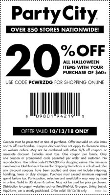 Party City Coupons & Promo Codes for $10 Off in 2022 Save at Party City with their online and in-store coupons. You can save up to 20 percent off, plus enjoy free gifts with select purchases. Check your local Party City ad for this month's coupons, or sign up online to get offers delivered to your inbox. SHOPPING GUIDE. Coupon policy: Sale and clearance items are not eligible for discounts ...