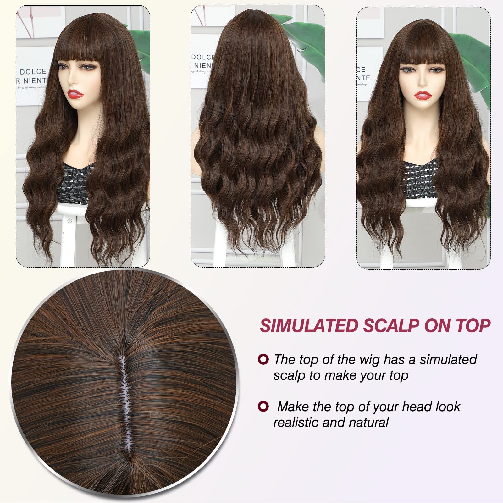 HUA MIAN LI Long Wavy Wig with Bangs Synthetic Wig for Women - Cheap Wigs Natural Looking 26 inch Hair Replacement Cosplay Wig for Party Body Wave ...